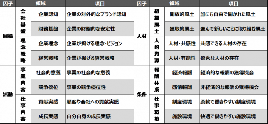エンプロイーエンゲージメントサーベイで用いている16領域のエンゲージメントファクターのうち、新入社員が認識可能な「会社」の8領域を抽出。その8領域をさらに16領域・全64項目に分類し(※2) 、それぞれの項目について期待度・満足度の2つの観点で質問を行う。回答者はそれぞれの期待度、満足度を5段階で回答する。