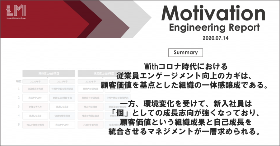 株式会社リンクアンドモチベーションの研究機関モチベーションエンジニアリング研究所(以下、当研究所)は、Withコロナ時代における「従業員エンゲージメントと新入社員意識の変化」に関する調査を行いましたので、結果を報告いたします。