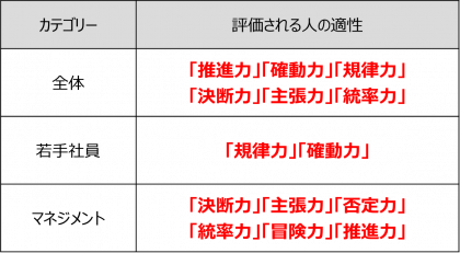 まず、全体の傾向としては、 評価される人の適性は、「推進力」「確動力」「規律力」「決断力」「主張力」「統率力」であることがわかった。次に、若手社員(新卒1~5年目)で評価される人の適性は、「規律力」「確動力」であった。また、マネジャーとして評価される人の適性は、「決断力」「主張力」「否定力」「統率力」「冒険力」「推進力」であった。