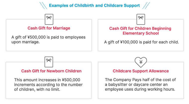 This system allows employees to temporarily change their work style due to childbirth, childcare, caring for an elderly relative, injury, illness or work-related accidents. Employees can use the program for childcare until the child’s graduation from junior high school. At the same time, we also reassess expectations based on changes in work performance.