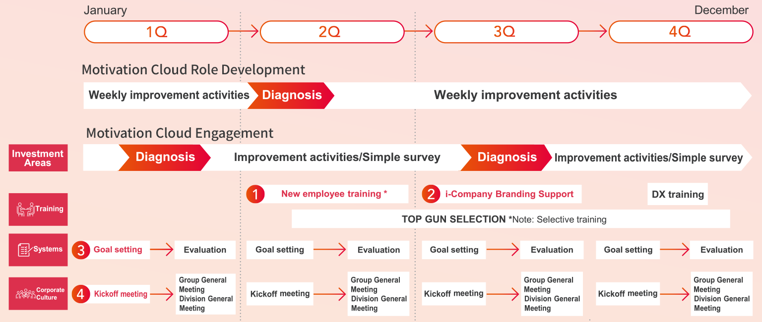 The company conducts organizational diagnosis using Motivation Cloud Engagement once every six months, and once every month or so we also fill out a simple survey on focus items to confirm progress. Then at the next team meeting, the members make sure we are all on the same page.