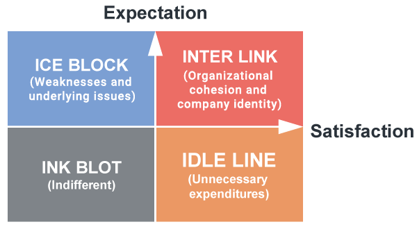 A study conducted by the Link and Motivation Group’s research organization, the Motivation Engineering Institute, has shown the relationship between engagement and corporate performance and investment metrics. Using Link and Motivation’s Motivation Cloud Engagement service, we visualize priority issues based on two key axes: employee expectations and satisfaction, and utilize this data to drive organizational improvement.