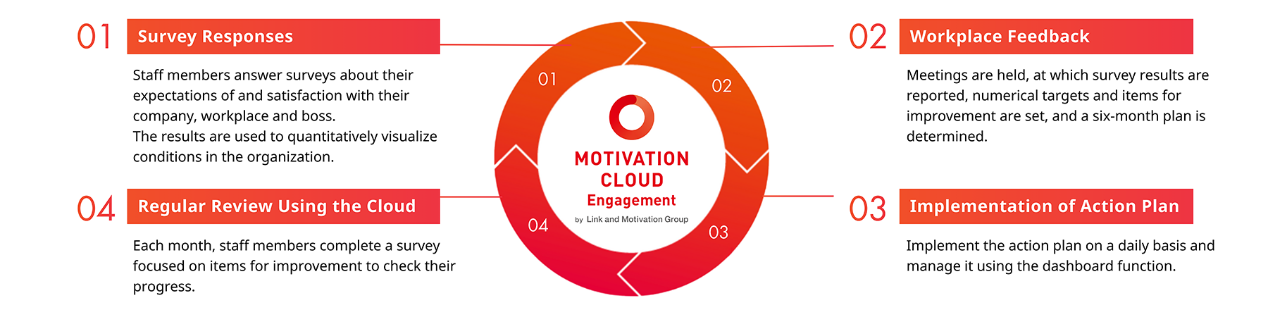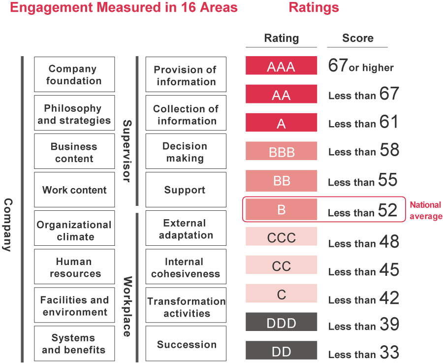Motivation Cloud Engagement is used to diagnose engagement, which is the level of sympathy employees feel toward their company, with the aim of identifying issues. We then design an organizational improvement (transformation) plan to establish a cycle that increases engagement. The results are disclosed semiannually as an Engagement Rating on an 11-level ratings scale based on the Engagement Score.