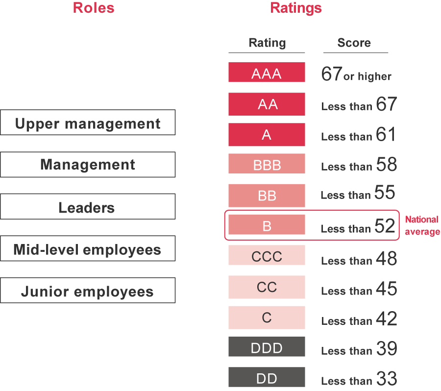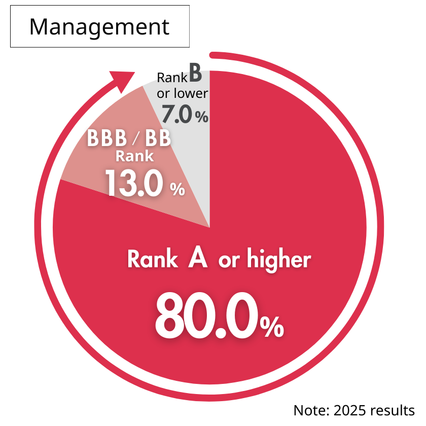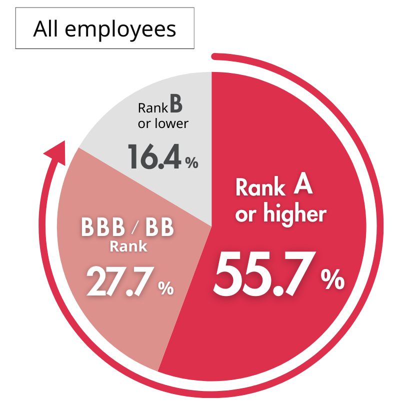 Our Role Survey Rating, which indicates our human resource capabilities, remains at a high level, with approximately 84% of all employees and approximately 93% of managers ranking higher than “B,” the national average.