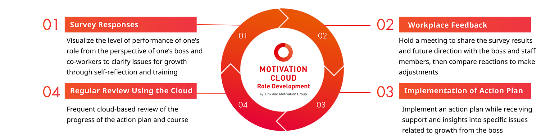 Through Motivation Cloud Role Development, we assess performance in meeting individual role expectations using multi-faceted evaluations to identify areas for improvement. We then design individual growth (transformation) plans and continuously apply a cycle of strengthening human resource capabilities.