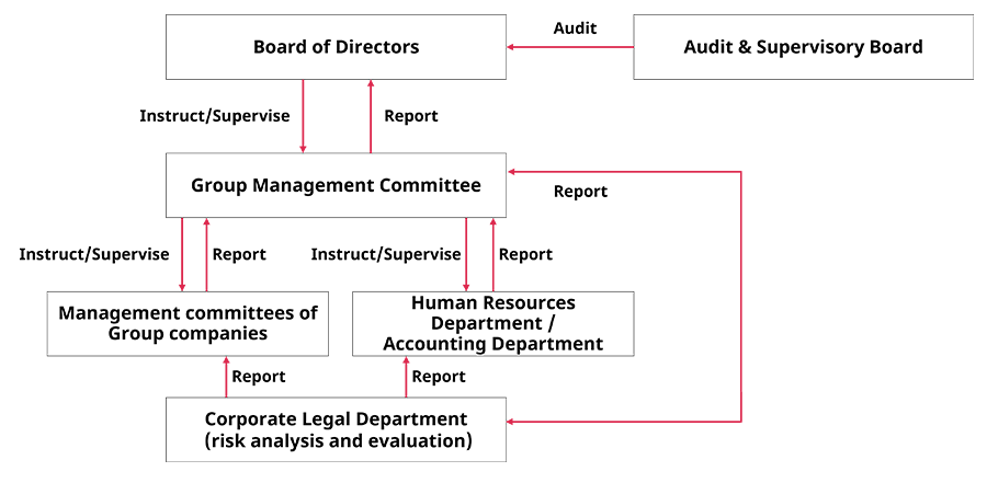 In an effort to maximize human capital, the Corporate Legal Department conducts cross-functional risk analysis and evaluation, and regularly submits reports to be discussed at meetings of the Group Management Committee, with the Board of Directors supervising related business execution.