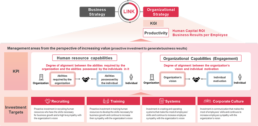 We place importance on human resource capabilities, which indicate the degree of alignment between the abilities required by the organization and those possessed by individuals.