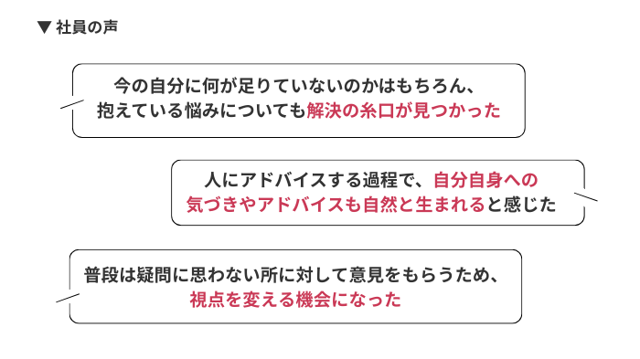 この研修の場は、参加者がサーベイ結果を“与えられた評価”としてではなく、自身の行動を見直すための材料として受け止められる機会になっています。特に若手は担当領域が限定され、視野が狭まりやすい傾向がありますが、非日常の研修環境で結果を外部化・言語化・相対化することで、一人で抱え込む状態から抜け出しやすくなります。メンバーの多様な意見に触れる中でサーベイ結果の背景理解が進み、半年後の目指す姿もより具体的に描けるようになり、前向きな行動変容へとつながっています。