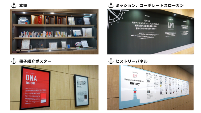 特に社内外の多くの人が訪れる来客エリアでは、当社グループの理念や歴史に関する展示を行っています。基幹技術である「モチベーションエンジニアリング」の源流となる哲学書を収めた本棚、ミッションやスローガンの展示、理念冊子の紹介ポスター、創業当時からの歩みをまとめたヒストリーパネルなどがその一例です。これらの展示は訪れた人との会話を生み出すきっかけとして機能しており、展示を起点とした対話を通じて、当社グループの価値観や考え方への理解や共感が自然と深まっていきます。