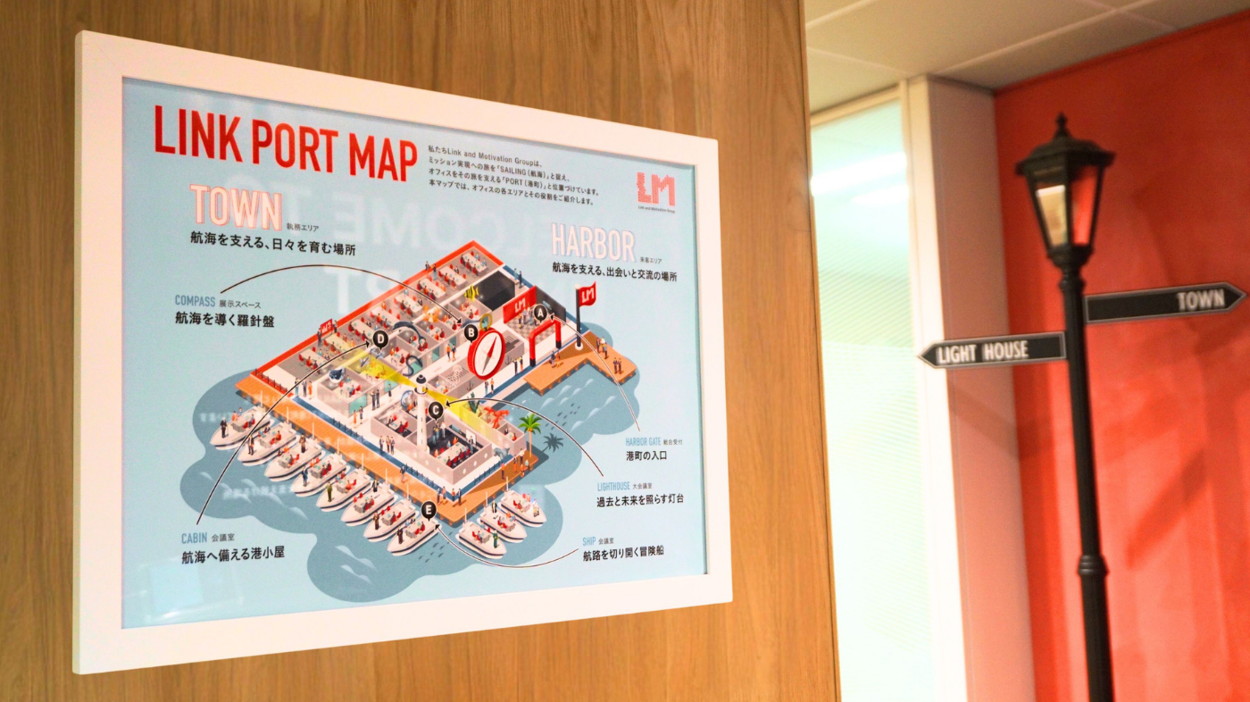 当社グループでは、ミッション実現に向けた歩みを「SAILING(航海)」、その航海を支えるオフィスを「PORT(港町)」と捉え、その世界観に基づいてオフィスづくりを行っています。オフィスは、社員が日々の業務に取り組む執務エリア「TOWN」と、社内外との交流が生まれる会議室エリア「HARBOR」の大きく2つで構成されています。会議室「SHIP」「CABIN」には冒険家や海の生物の名前を付け、会社の理念・歴史を伝える展示エリア「LIGHTHOUSE」を設けるなど、オフィスそのものが当社グループの価値観や目指す方向性を伝える“メディア”として機能しています。