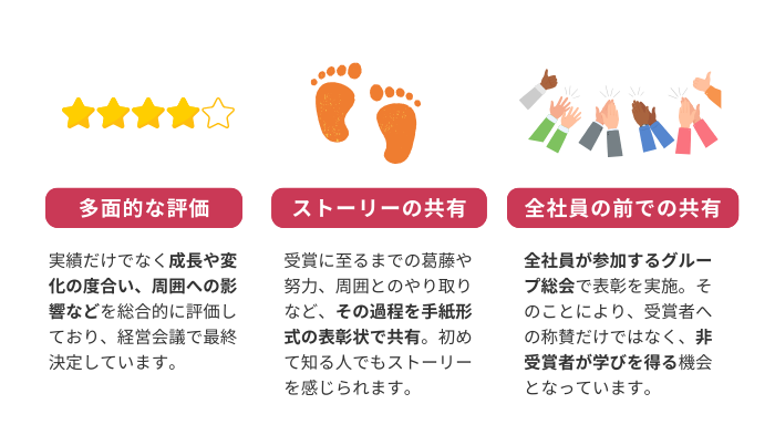 一般的に、優れた業績そのものを称え、「受賞者」を対象としたエンゲージメント向上を目的とする表彰が多い一方で、当社グループは「非受賞者」も含めた全社員を対象として表彰制度を設計しています。具体的な特徴は以下のとおりです。
