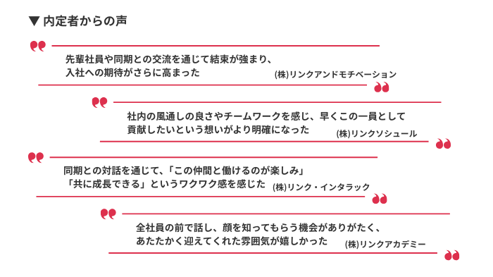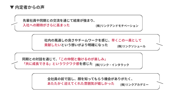 社員や内定者同士で交わす言葉を通して、内定者一人ひとりが“未来の仲間”としての自覚を育み、入社への期待を高める機会となりました。