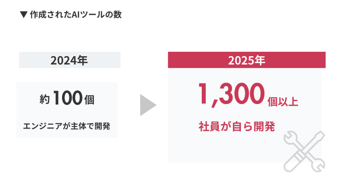 その結果、コンサル・クラウド事業の全社員が1日1回以上AIツールを活用する「AI活用人材」に認定され、2025年には生成されたAIツールが1,300個を超えるなど、活用は加速度的に進化しました。