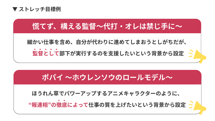 ストレッチ目標は社員自身が自分の言葉で設定する定性的な成長目標です。「どんな力を伸ばしたいか」「次にどんな姿を目指したいか」といった観点から、日々の業務と結びつけながら設けることで、日常の中で意識しやすく、行動につながりやすいのが特徴です。