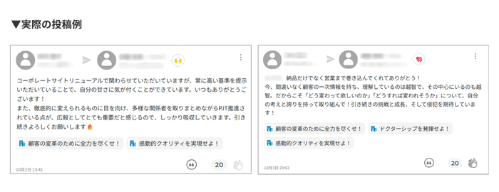「Unipos」は組織内で見られた、「組織の目指す姿に対する良い行動」を言語化し、称賛メッセージを相手に送ることができるコミュニケーションプラットフォームです。当事者だけでなく、他のメンバーも投稿を閲覧し「拍手」で称賛を送れるため、組織全体で「良い行動」を共有し、第三者の視点から基準や学びを得られる風土づくりにつながります。