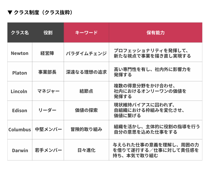また、各クラスには偉人の名前が付けられており、歴史に名を刻む新たなヒーロー・ヒロインが生まれてほしいという願いが込められています。社員はその人物が象徴する価値観や挑戦の姿勢を自らの行動に重ね、日々の業務に取り組んでいます。