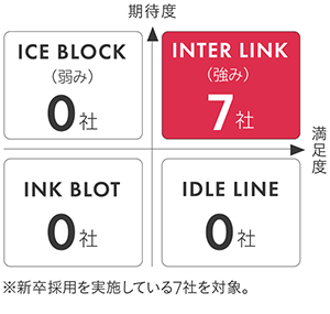 企業の採用に関して期待度・満足度で診断する、リンクアンドモチベーションの『エントリーマネジメントサーベイ』を活用しています。各項目の中でも、理念への期待度・満足度がともに高い状態を目指しており、診断結果をもとにした採用戦略立案によって、ミスマッチの少ない採用を実現しています。結果として、実際に多くのグループ会社において、「理念戦略」が、期待度・満足度がともに高い「INTER LINK」に位置しています。