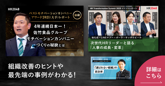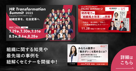 事例・知見 HOME 事例・知見 事例 View All 東京海上日動火災保険株式会社様 企業成長に直結する「エンゲージメント」向上のため、組織のPDSサイクルを回す エンゲージメント向上組織診断 日本航空株式会社様 3万5千人のスタッフへの「新生JALブランド」の浸透をご支援。 理念浸透風土改革 パナソニック ホールディングス株式会社/パナソニック オペレーショナルエクセレンス株式会社 マネジャーが「ピープルマネジメント」に注力できるようエンゲージメントサーベイを導入 エンゲージメント向上マネジメント強化 四條畷市様 「まずは市役所から変わらなければならない」11年ぶりの転入増を果たした、副市長の組織改革 エンゲージメント向上風土 動画 組織・人事領域の最前線で起きている変化や、企業変革を成功に導いた実践事例を、経営者・人事の皆様に向けた解説動画としてお届けしています。長年にわたり組織変革に携わってきたコンサルタントのセミナーや、経営者・人事トップとの実践的な対話から、組織変革のヒントが得られます。今まさに組織課題に直面している方はもちろん、これからの組織づくりを見据える方にもご活用いただけます。 記事 企業経営や人事領域の最新トピックを解説した資料や、実践者と有識者による対談記事などを通じて、具体的な事例に基づいた組織変革の知見をお届けします。組織改革に着手したばかりの方から、すでに実行フェーズに入っている方、さらに中長期的な構想を描いている方まで、変革のヒントや、次の一手を見つけるための情報源として、幅広くご活用いただけます。 名和教授×日立製作所 CHRO V字復活を遂げた、日立グループの進化と人材戦略とは 2024‐10‐18 丸紅×マツダ×コカ・コーラ ボトラーズジャパン×日本経済新聞 これからのCHRO~経営における人事の役割・視座とは~ 2024‐10‐18 岩本特任教授×味の素 特別顧問 企業価値向上に繋がる「人的資本経営」とは 2024‐10‐18 伊藤邦雄教授、パナソニックCHROが語る ステークホルダーの心を動かす「人的資本開示と実践」 2023‐11‐14 表彰 社員のモチベーションを成長エンジンとし、持続的な成長を実現する“モチベーションカンパニー”を増やすことを目指して、当社では2011年より「ベストモチベーションカンパニーアワード」を開催しています。有識者や実践企業が一堂に会し「経営と人事の未来」について意見を交わし、共にメッセージを発信する場として、毎年多くの注目を集めています。