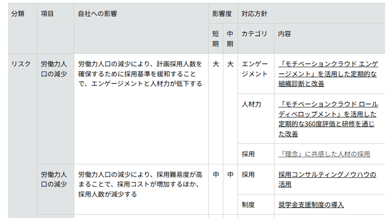 当社は企業価値向上において、人的資本が最も重要な資本であると認識しています。前述した環境変化を踏まえ、人的資本に関する情報開示を拡充しました。具体的には、4つの開示項目(ガバナンス、戦略、リスク管理、指標と目標)に基づき、当社グループの対応状況を整理しています。特に「戦略」項目においては、日本の将来推計人口に基づくシナリオ分析を実施し、当社グループの事業に及ぼしうる重要なリスクと機会を特定しました。これらの分析結果は、今後の経営判断やリスクマネジメントの高度化に反映していきます。今後も、継続的な改善を図りつつ、人的資本マネジメントの強化に努めてまいります。