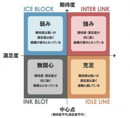 回答結果は、期待度×満足度の2軸で整理された「4eyes® Windows」(※図1)で編集されます。期待度および満足度がともに高い右上の象限が“組織の強み”、期待度は高いが満足度は低い左上の象限が“組織の弱み”となります。