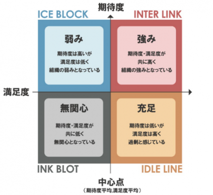 「4eyes® Windows」(※図2)で編集されます。期待度および満足度がともに高い右上の象限が“組織の求心力”、期待度は高いが満足度は低い左上の象限が“組織の課題”となります。