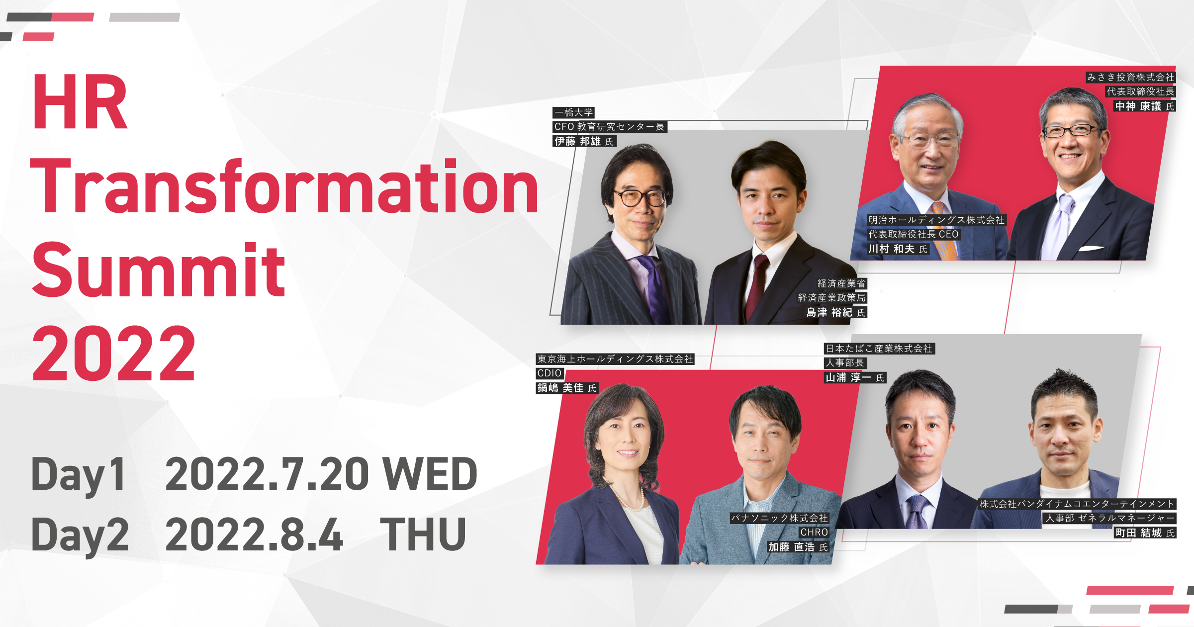 そこでこの度、一橋大学伊藤教授、経済産業省島津氏、明治ホールディングスCEO川村氏をはじめ、人的資本経営の実践に際して第一線でご活躍されている方にご登壇いただき、それぞれの立場から情報と知見を共有する「HR Transformation Summit 2022」を開催することにいたしました。