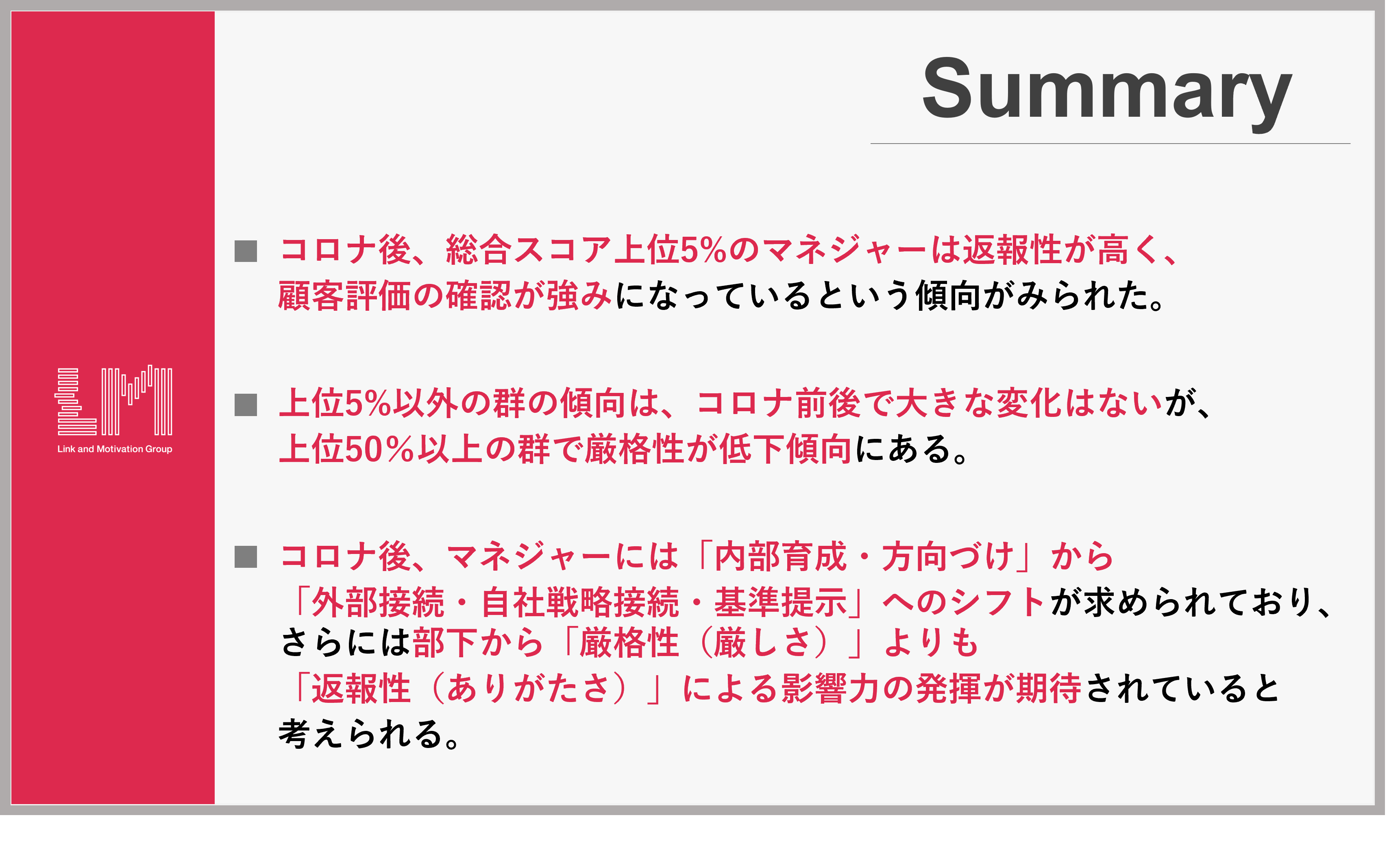 研究開発 HOME 研究開発 新着情報 2025.11.19 新卒就職活動生の傾向に関する調査結果(2013~2024年度)を公開 2025.9.19 部下から評価されるマネジャーの傾向に関する調査結果を公開 2025.8.8 「従業員エンゲージメントと投資指標の関係性」 に関する調査結果(2024年データ分析)を公開 最新の研究結果一覧 モチベーションエンジニアリング研究所 経営学・社会システム論・行動経済学・心理学などの学術的理論と実践的な経営コンサルティングの知見を融合し、組織・人材領域の研究とサービス開発を行う社内シンクタンクです。 出版物 「組織と働き方の本質」 (日本経済新聞出版) 著:小笹 芳央 当グループの出版物