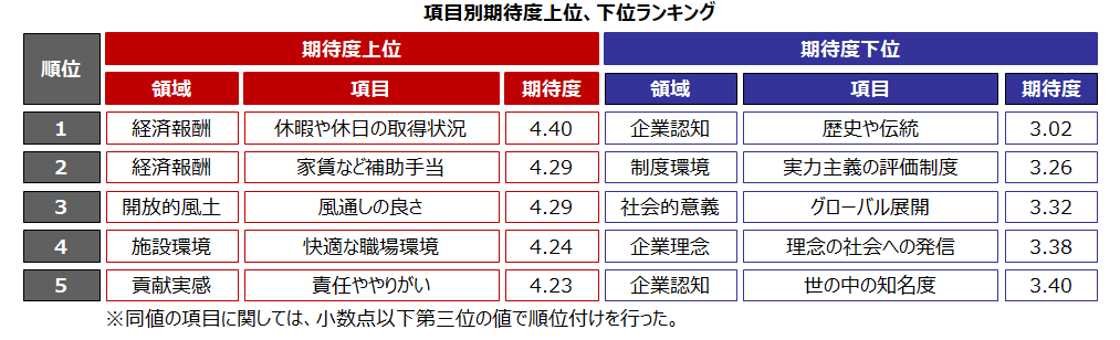 項目別の期待度を見ると、「休暇や休日の取得状況」「家賃など補助手当」など、「待遇の良さ」に関する項目が上位を占めた。また「風通しの良さ」「快適な職場環境」が上位であるのに対し、「実力主義の評価制度」が低位に入ったことから、無理なく働きたいという傾向が見受けられる。こうしたことから、今年の新入社員は、総じて「居心地の良い環境で、無理なく働きたい」という”個人志向”が強いと言えるだろう。