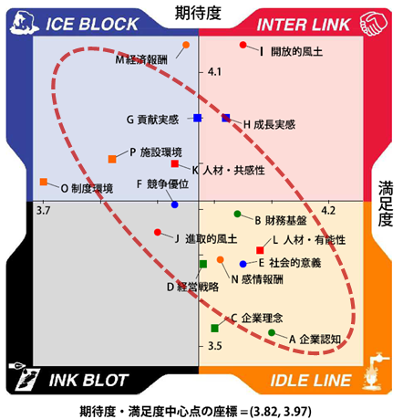 具体的には、「ICE BLOCK」(期待度:高 満足度:低)には「経済報酬」「制度環境」「施設環境」「人材・共感性」があがった。