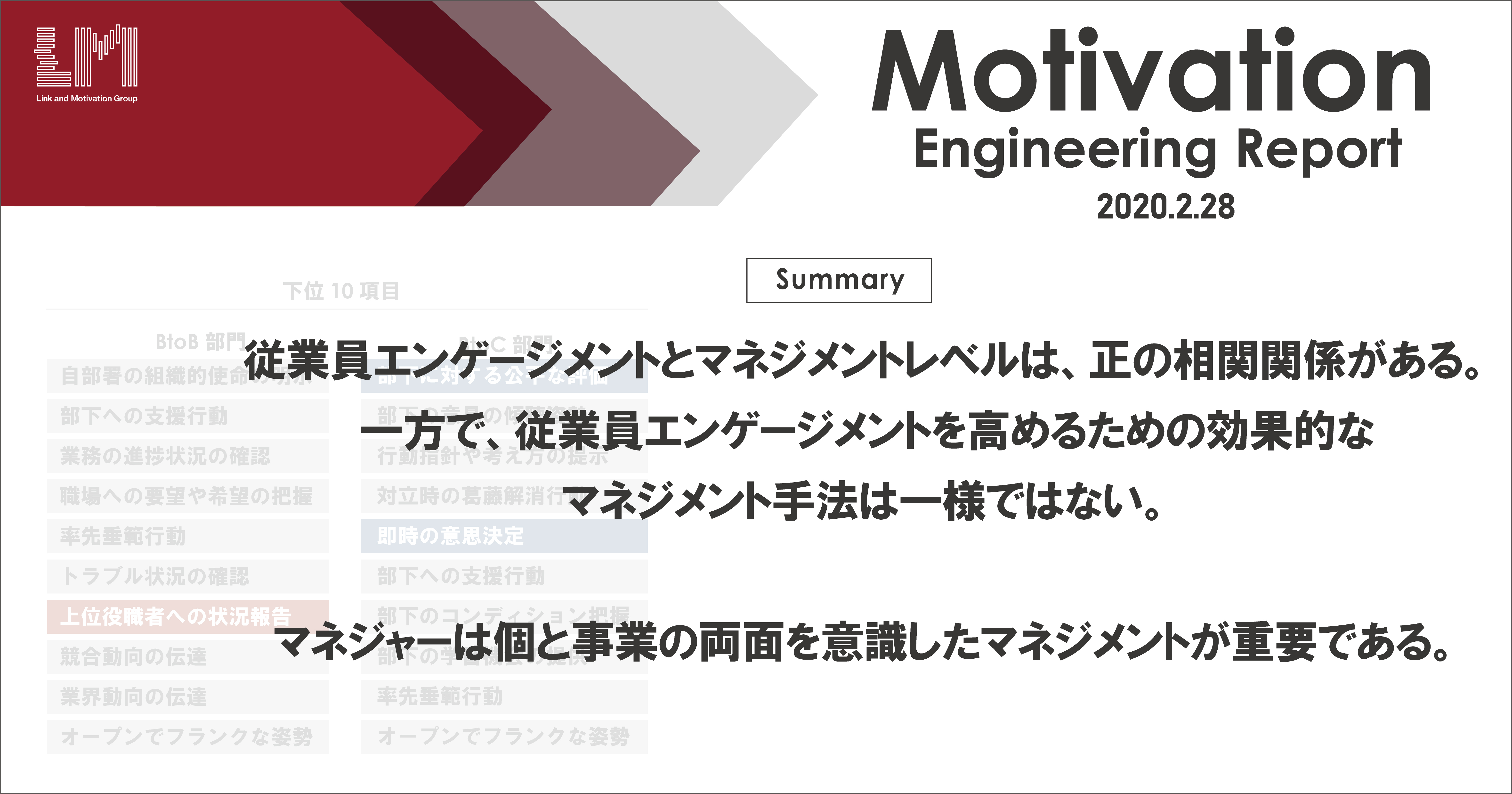 当社の研究機関モチベーションエンジニアリング研究所(以下当研究所)は「従業員エンゲージメントとマネジメントレベルの関係」に関する調査を行いましたので、結果を報告いたします。