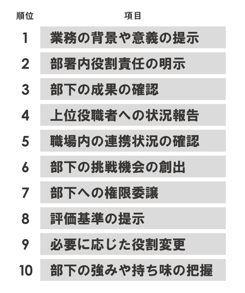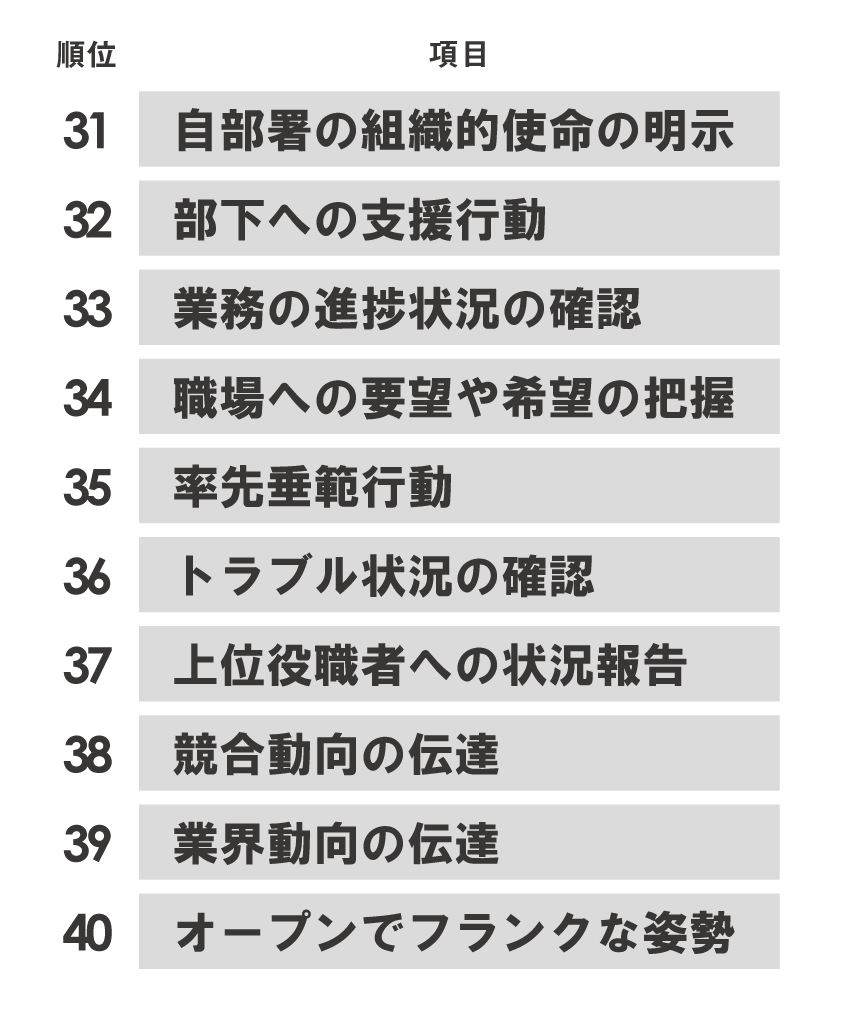 あくまで当グループのデータではあるものの、今回の調査結果で明らかになったことは、マネジメントサーベイ部下回答版のスコアとマネジャーが担当している部署のESが、正の相関関係にあるということだ。従業員エンゲージメントを高めるためには、まずはメンバーと向き合い関係構築をしていく必要があるということだろう。