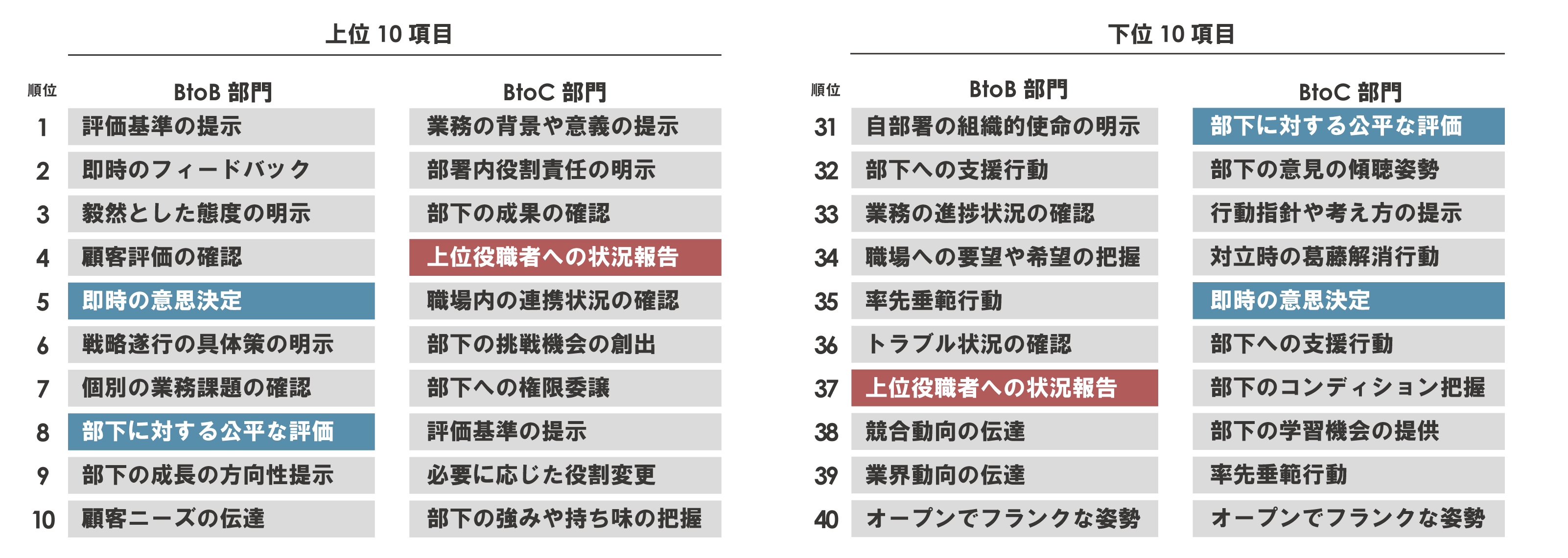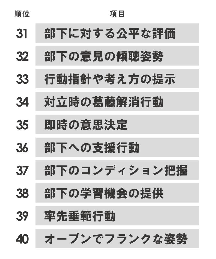 ②、③の調査を比較した結果を図6に示す。この結果から、ESとマネジメントサーベイの相関上位下位10項目は、組織開発Divisionと個人開発Divisionで異なることがわかる。中でも、全40項目のうち3項目(図6でハッチングしている項目)が、上位10位と下位10位で逆転している。例えば、「上位役職者への状況報告」は個人開発Divisionでは4位だが、組織開発Divisionでは37位である。これは、組織で動くことに加え店舗型ビジネスを展開しており、個々のメンバーが「見えにくい」個人開発Divisionと、個人で動くことに加え同じ拠点で働いており、個々のメンバーが「見えやすい」組織開発Divisionの差ではないだろうか。このように、従業員エンゲージメントを高めるためのポイントは、事業特性によって異なることがわかる。