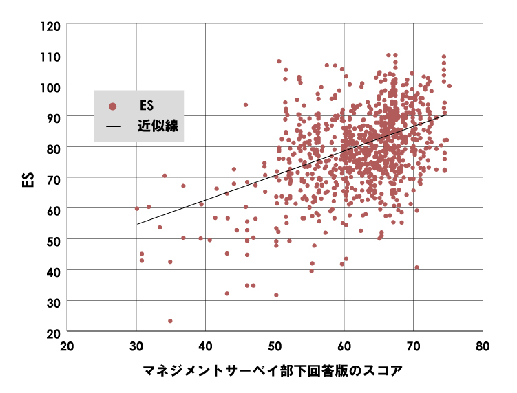 ① マネジメントサーベイの結果をスコア化し、マネジャーの担当部署のESとの相関関係を調べた。