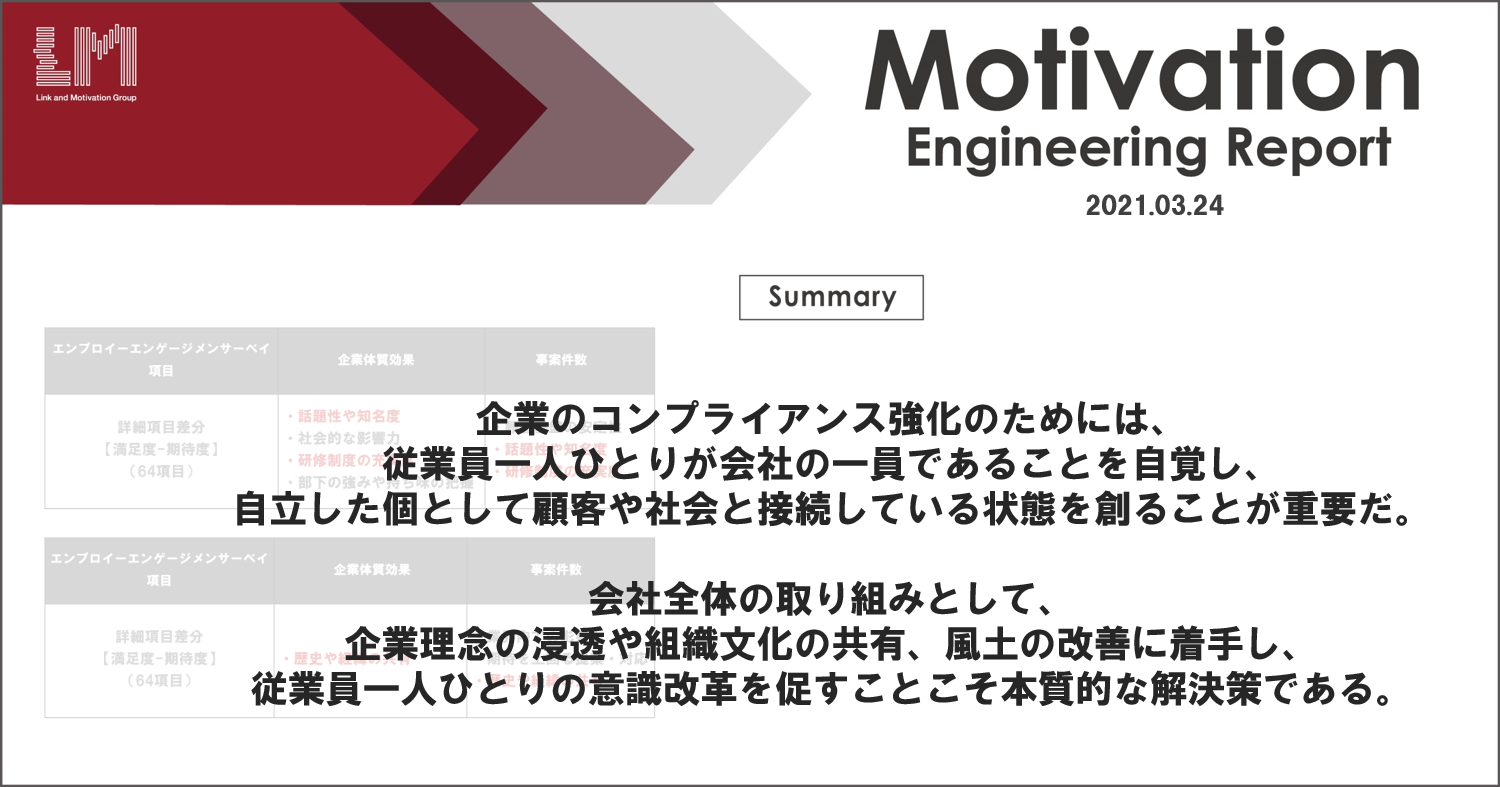 株式会社リンクアンドモチベーション(本社:東京都中央区、代表:小笹芳央、証券コード:2170、以下当社)の研究機関モチベーションエンジニアリング研究所(以下当研究所)は、株式会社日本総合研究所(以下、日本総研)と共同で「企業不祥事と従業員エンゲージメントの関係」に関する調査を行いましたので、結果を報告いたします。