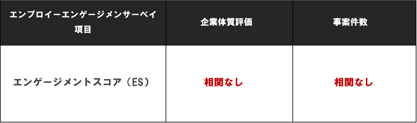 まず、ESと不祥事の関係を調べてみたが、ESとの相関関係を見出すことはできなかった。しかし、エンプロイーエンゲージメントサーベイの総合満足度やエンゲージメントファクター、詳細の64項目を調査すると有意義な示唆を得ることができた。