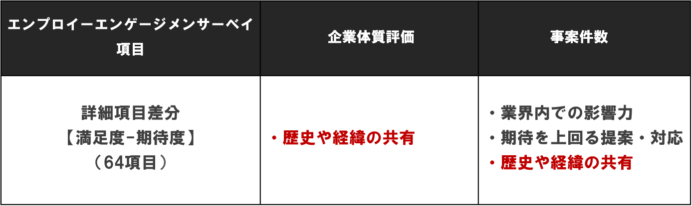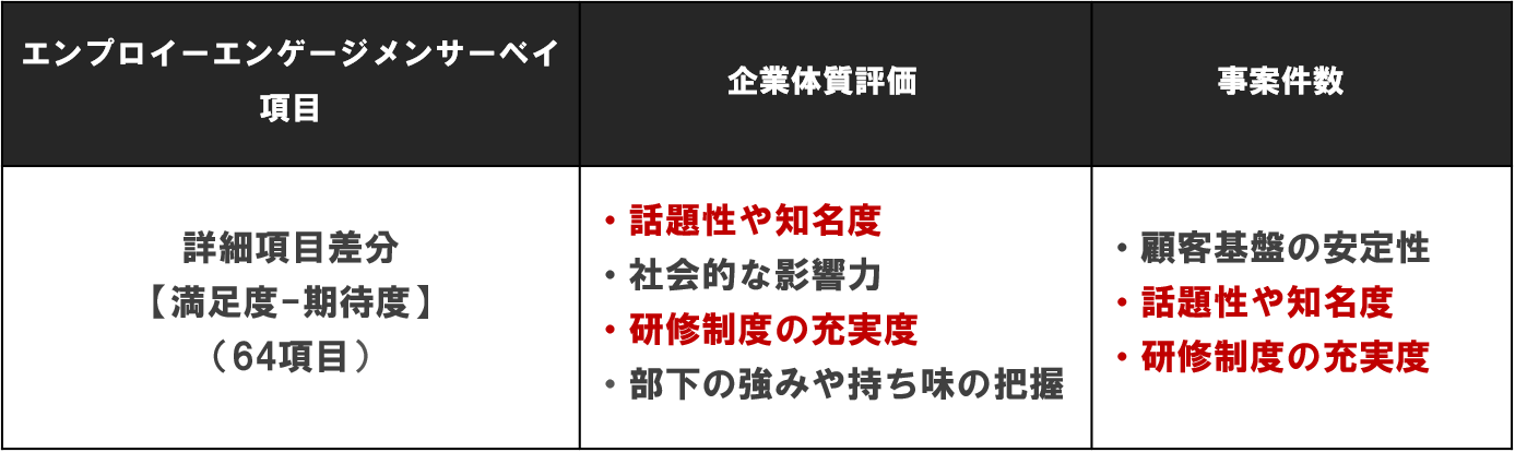 表4 エンプロイーエンゲージメントサーベイの詳細64項目の差分(満足度ー期待度)のうち、企業体質評価、不祥事事案件数と負の相関のある項目 ※赤字は共通する項目
