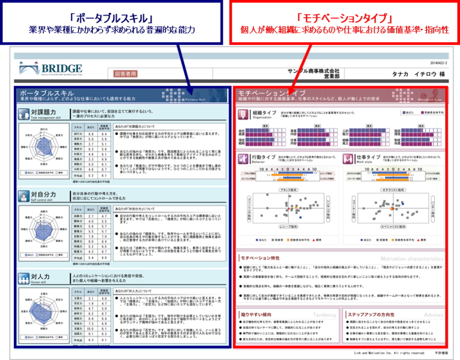 図1のような帳票が出力され、大きく「ポータブルスキル」と「モチベーションタイプ」の2つで構成されている。