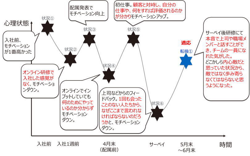図3のケースを見てみると、コロナ禍によるオンライン世代特有のモチベーションの低下があることがわかる。上司や職場メンバーとの関係性が構築される前に厳しい指摘を受けると大きくモチベーションが低下する傾向が見られた。その後、360度サーベイ実施後の職場共有の際に、本人と上司双方が胸襟を開いて本音で話すことができたことで、信頼関係の構築に繋がり、組織適応に至っている。