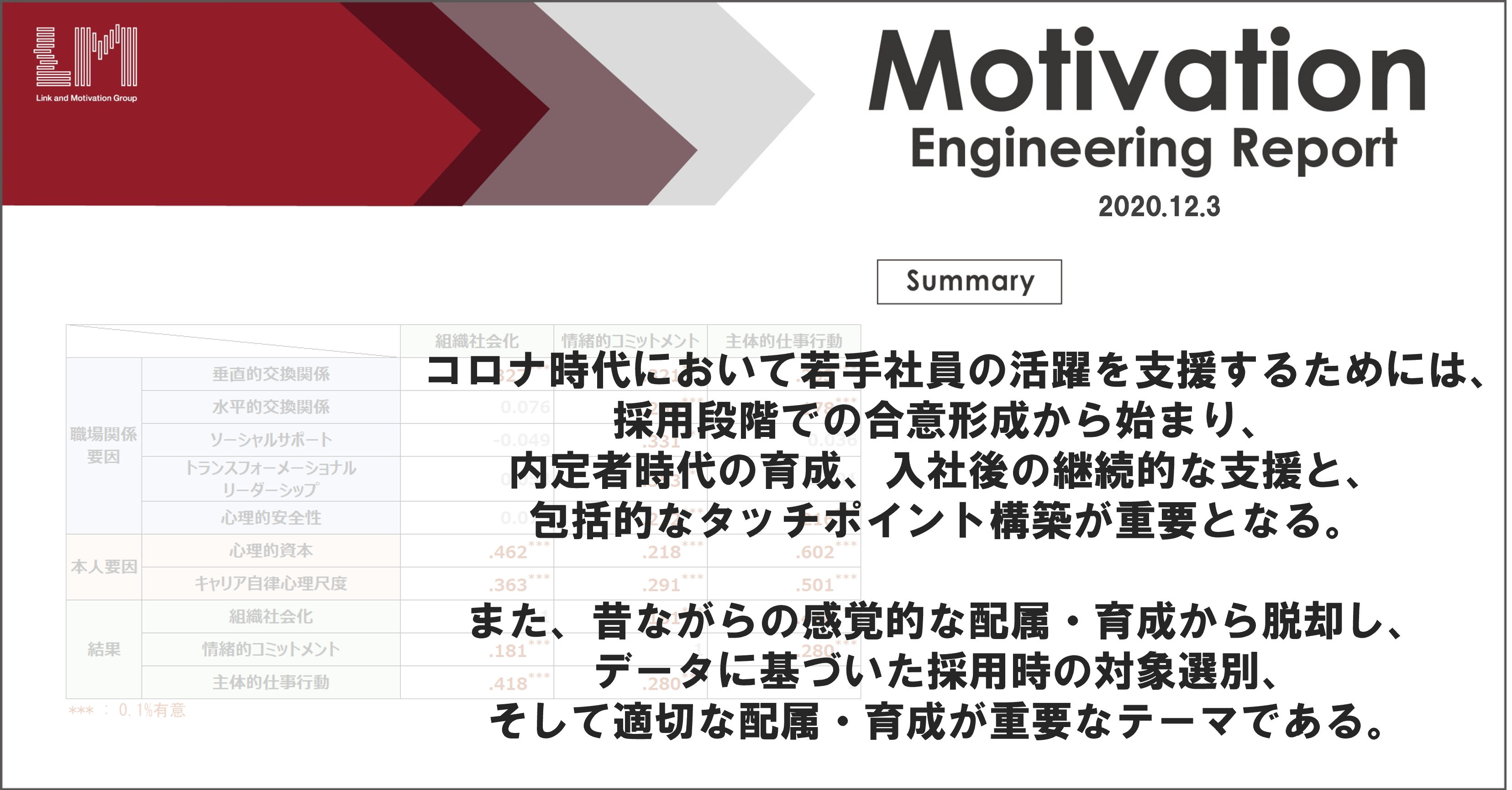株式会社リンクアンドモチベーション(本社:東京都中央区、代表:小笹芳央、証券コード:2170、以下当社)の研究機関モチベーションエンジニアリング研究所(以下当研究所)は、「コロナ時代における若手社員の活躍支援」に関する調査を行いましたので、結果を報告いたします。