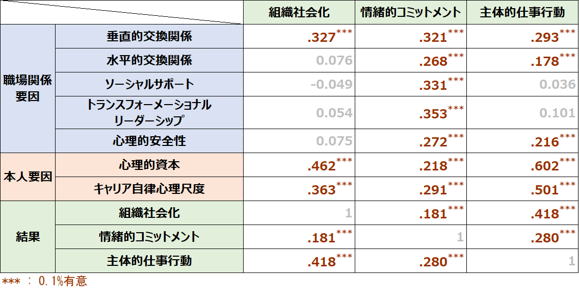 関係の有無が、組織社会化・情緒的コミットメント・主体的な仕事行動の全てと相関が高いことが明らかになった。