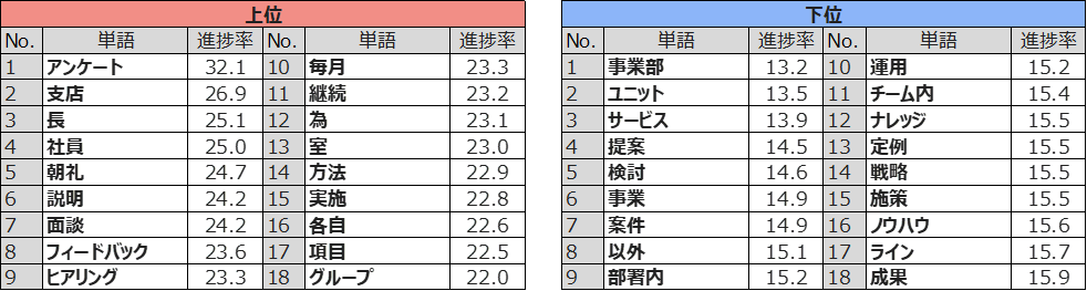 【1】アクションプランの進捗率が上位の単語は行動が明確なもの、下位は曖昧なものが多い