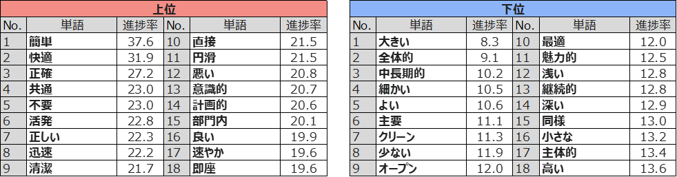 【2】アクションプランの進捗率が上位の単語は行動を形容するもの、下位は状態を形容するものが多い