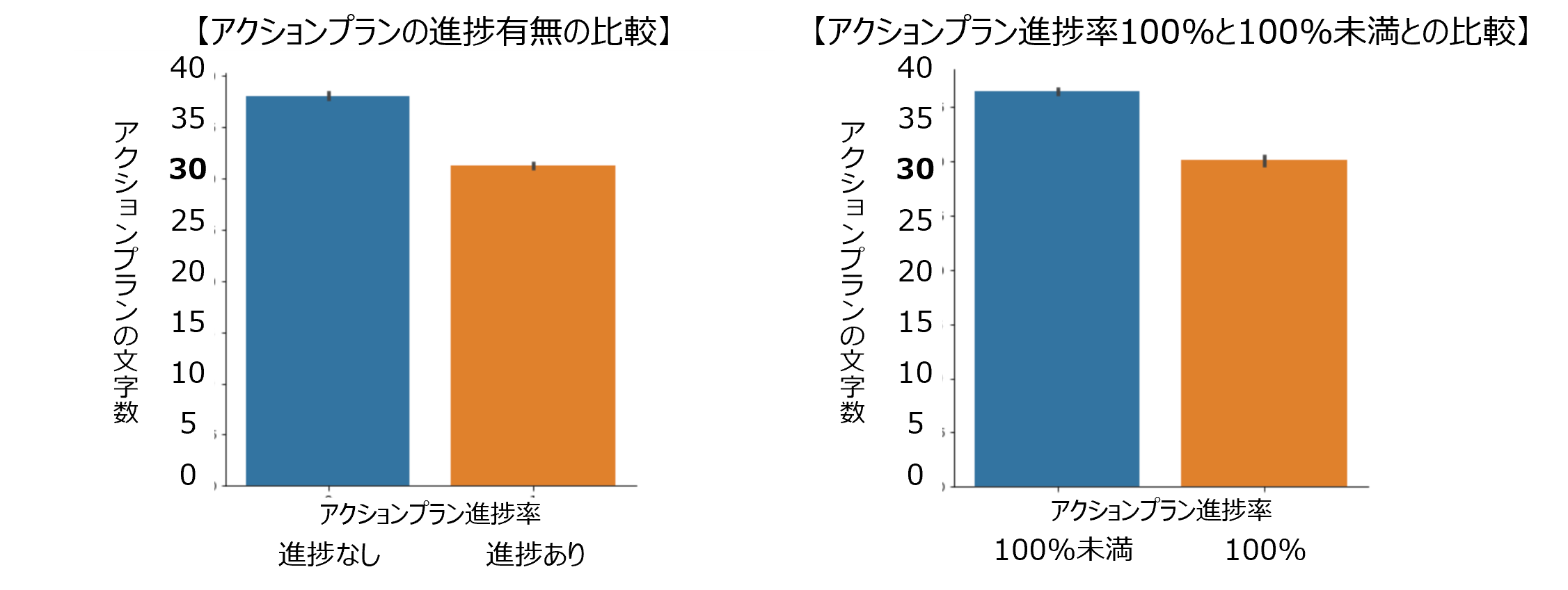 【1】アクションプランの進捗率が高い組織ほどアクションプランの平均文字数が「30文字」程度と、表現が短く端的になっている