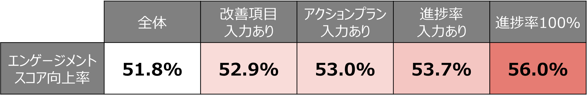このことから、アクションプランを進捗させ、持続している組織ほど、エンゲージメントスコアは向上していると言える。