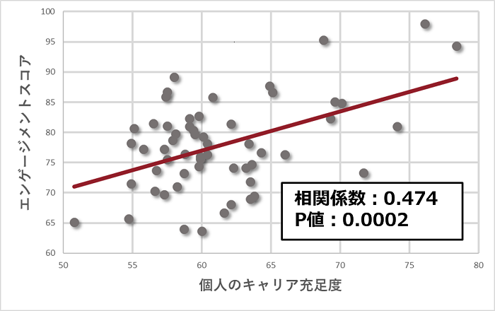 本調査の結果、個人の主観的なキャリア充足度と従業員エンゲージメントとは統計的に有意な正の相関関係が観察された。つまり、従業員の主観的なキャリア充足度が高い組織ほど、従業員エンゲージメントも高くなるということが明らかになった。