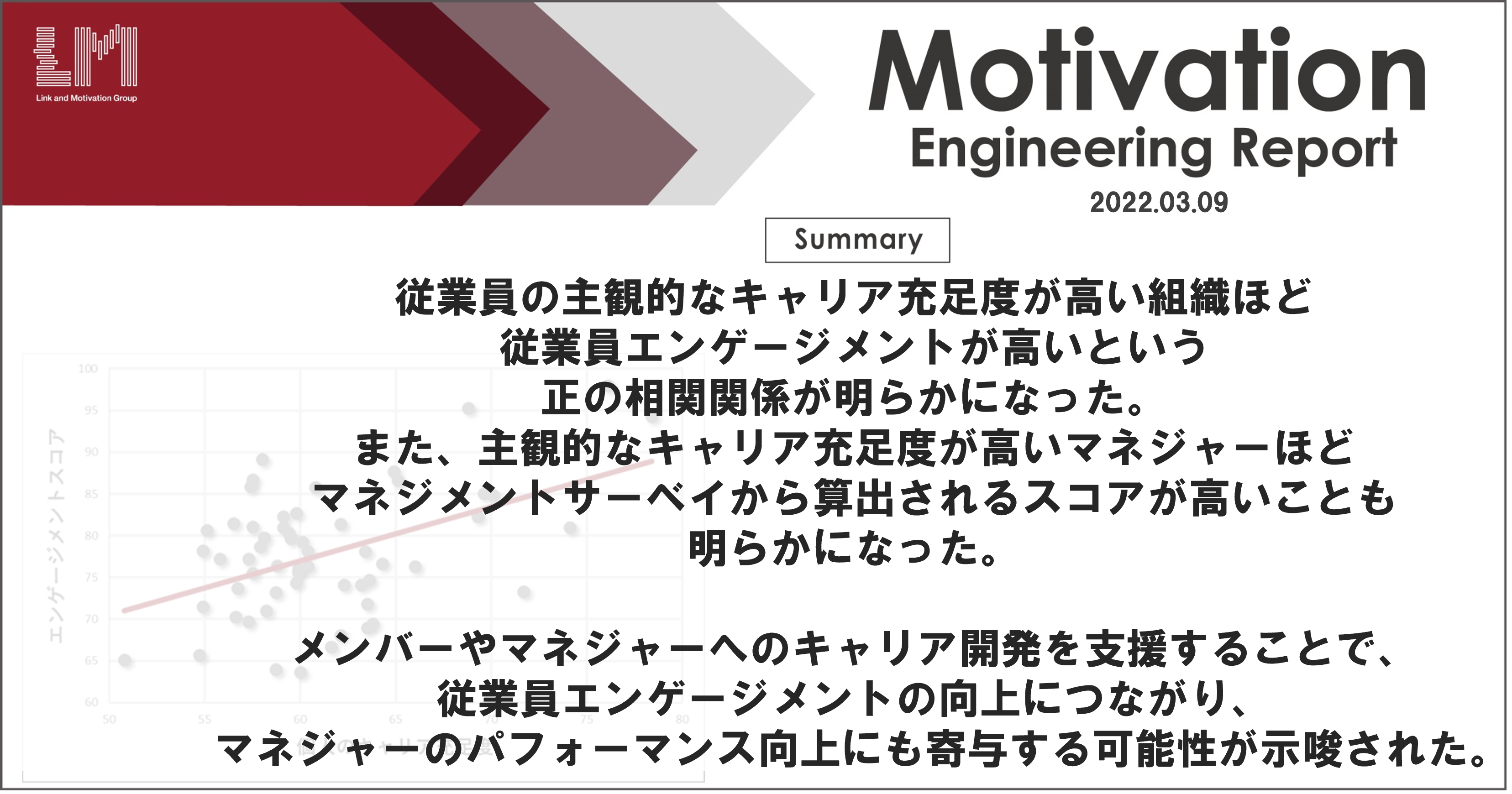 株式会社リンクアンドモチベーション(本社:東京都中央区、代表:小笹芳央、証券コード:2170、以下当社)の研究機関モチベーションエンジニアリング研究所(以下当研究所)は、「主観的なキャリア充足度と従業員エンゲージメントならびにマネジメントレベルとの関係性」に関する調査を行いましたので、結果を報告いたします。