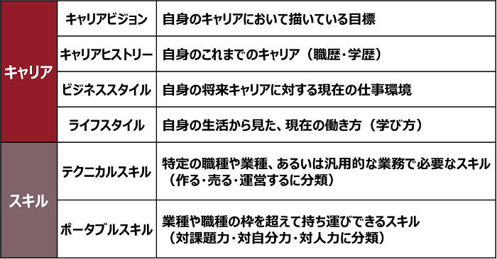 キャリアに対しては「キャリアビジョン」「キャリアヒストリー」「ビジネススタイル」「ライフスタイル」に対する満足度を測定し、スキルに対しては「テクニカルスキル」「ポータブルスキル」に対する、希望度・実現度を測定する。(図2参照)