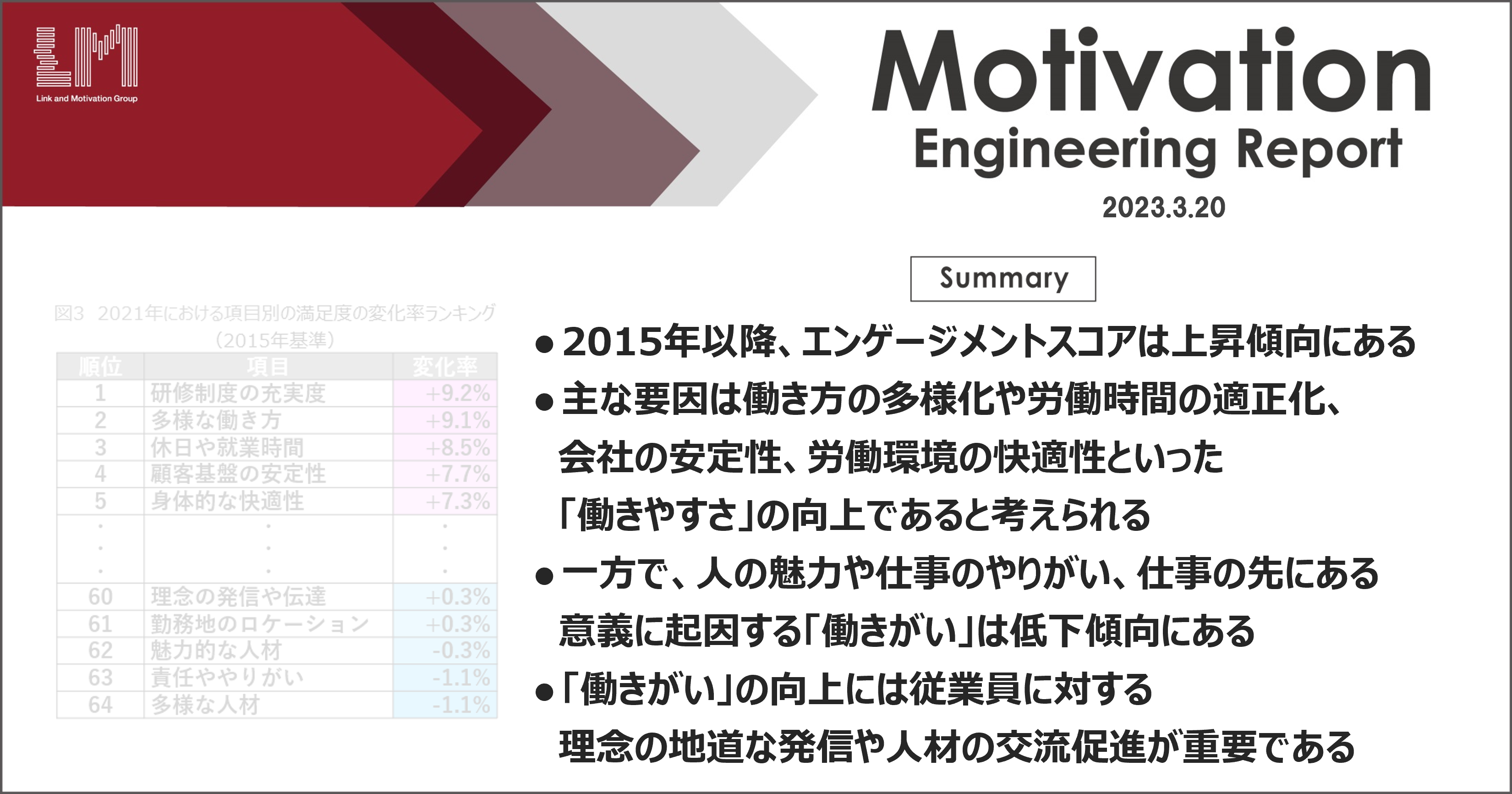 最新の研究結果 HOME 研究開発 モチベーションエンジニアリング研究所 最新の研究結果一覧 研究結果詳細ページ 「8,000社のデータから読み解く従業員エンゲージメントの変化と要因」に関する研究結果を公開 2023.3.20 株式会社リンクアンドモチベーション(本社:東京都中央区、代表:小笹芳央、証券コード:2170)の研究機関であるモチベーションエンジニアリング研究所は、「8,000社のデータから読み解く従業員エンゲージメントの変化と要因」に関する調査を行いましたので、結果を報告いたします。 調査結果は下記よりご覧ください。 ダウンロード 記事をシェアする