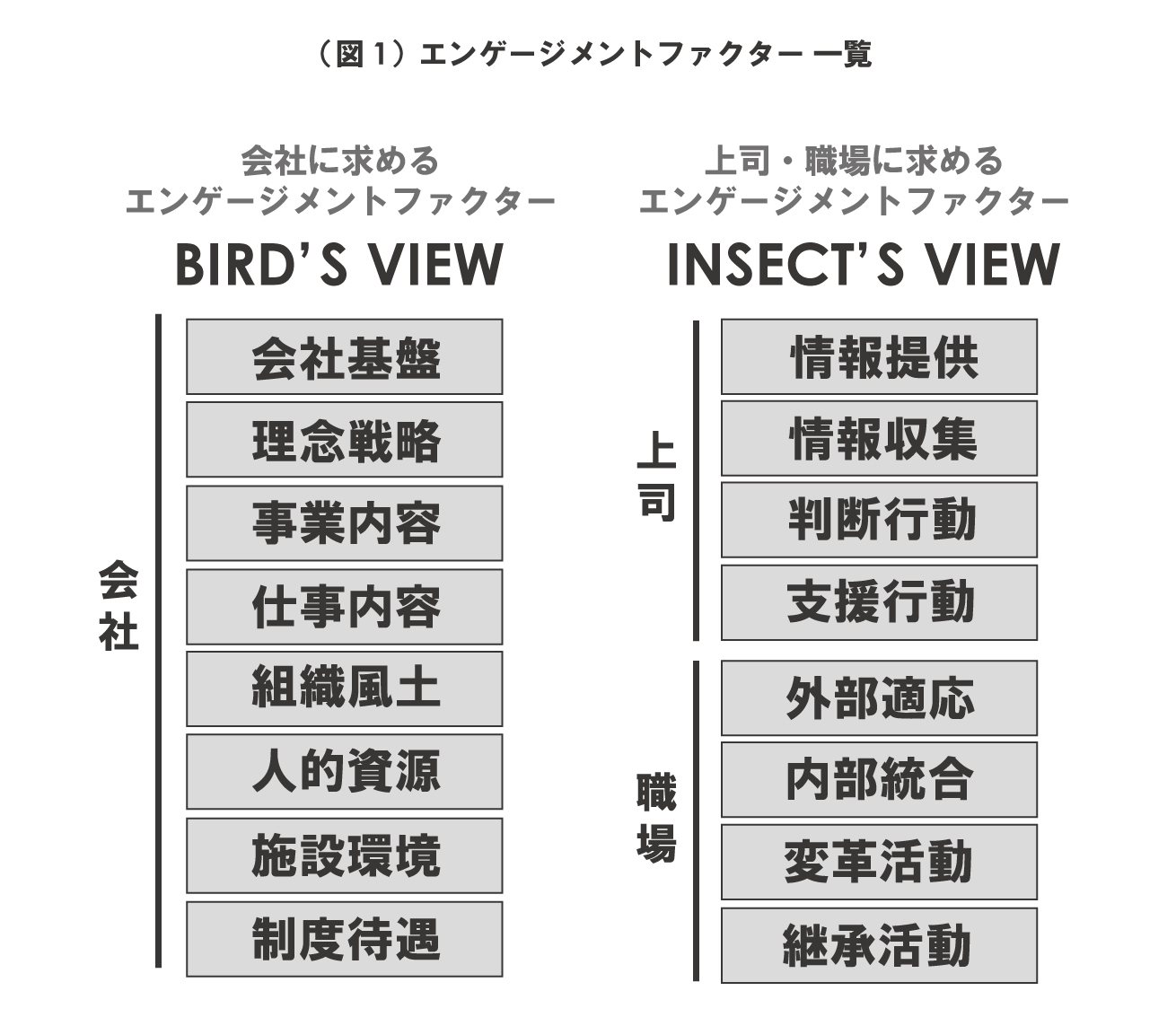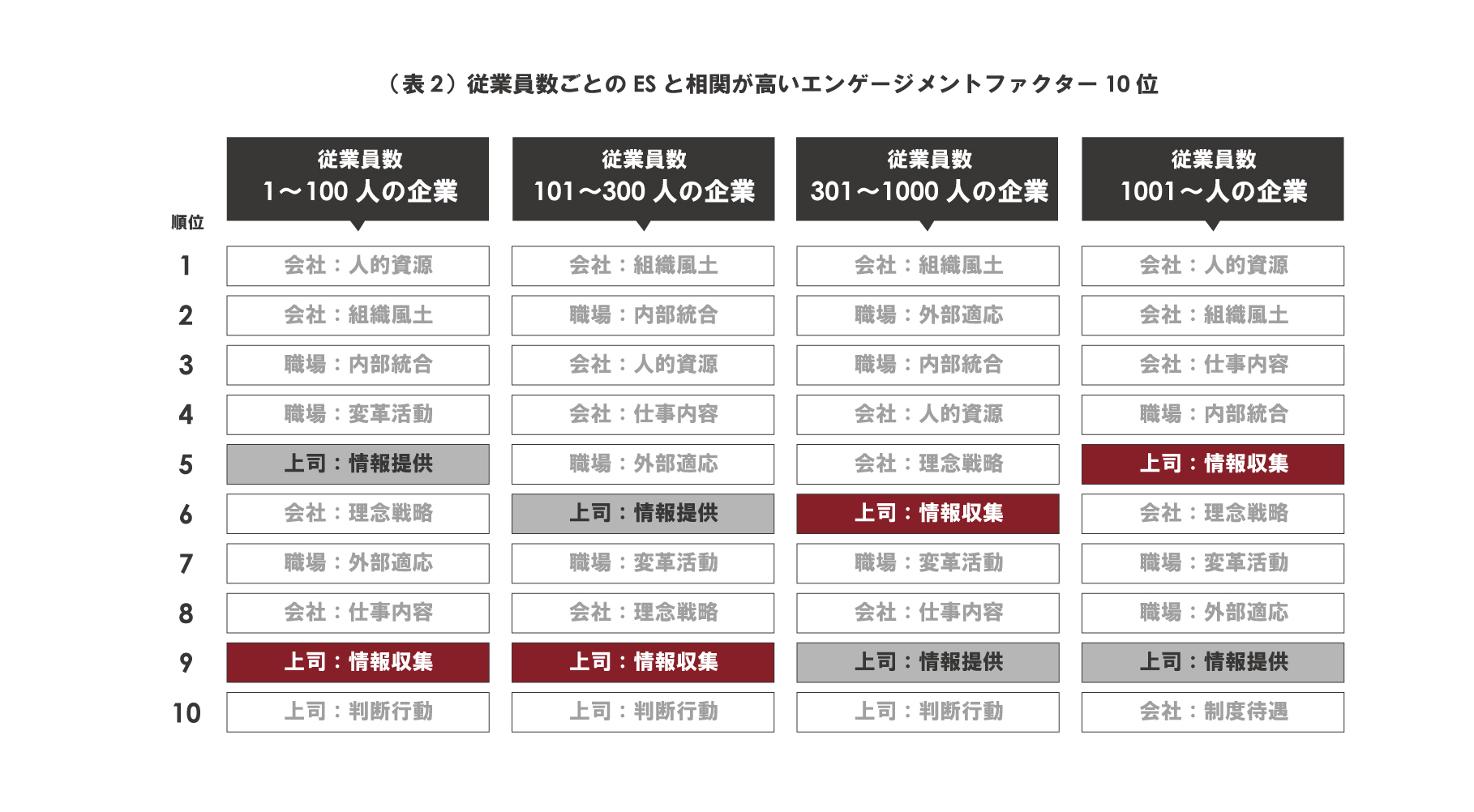 エンゲージメントファクター16領域のうち、従業員数ごとの、ESと相関が高い10位を(表2)に示す。従業員数が多いほど、直属上司の部下に対する「情報収集」とESとの相関は高くなる一方で、「情報提供」は相関が低くなる。「情報収集」には、部下の業務状況や個性、意思の把握などが項目として設定されている。「情報提供」には、部下に顧客ニーズや部署の目標、役割分担を伝えることなどが項目として設定されている。