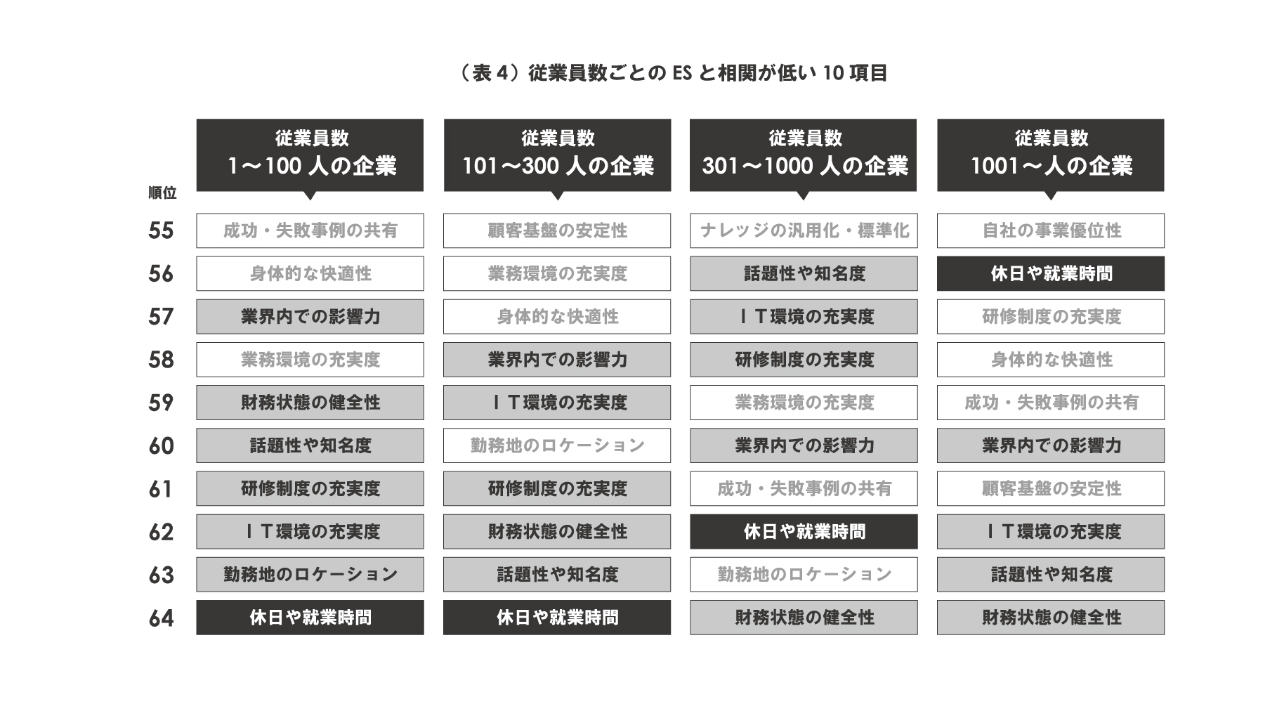 同様に、従業員数ごとの、ESと相関が低い10項目を(表4)に示す。